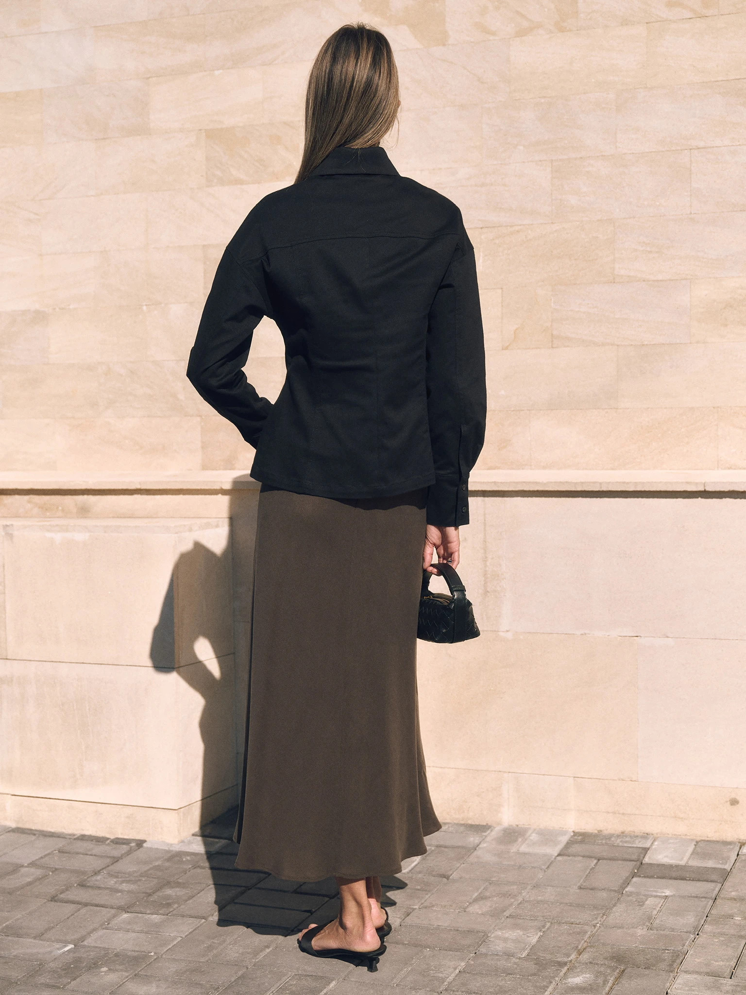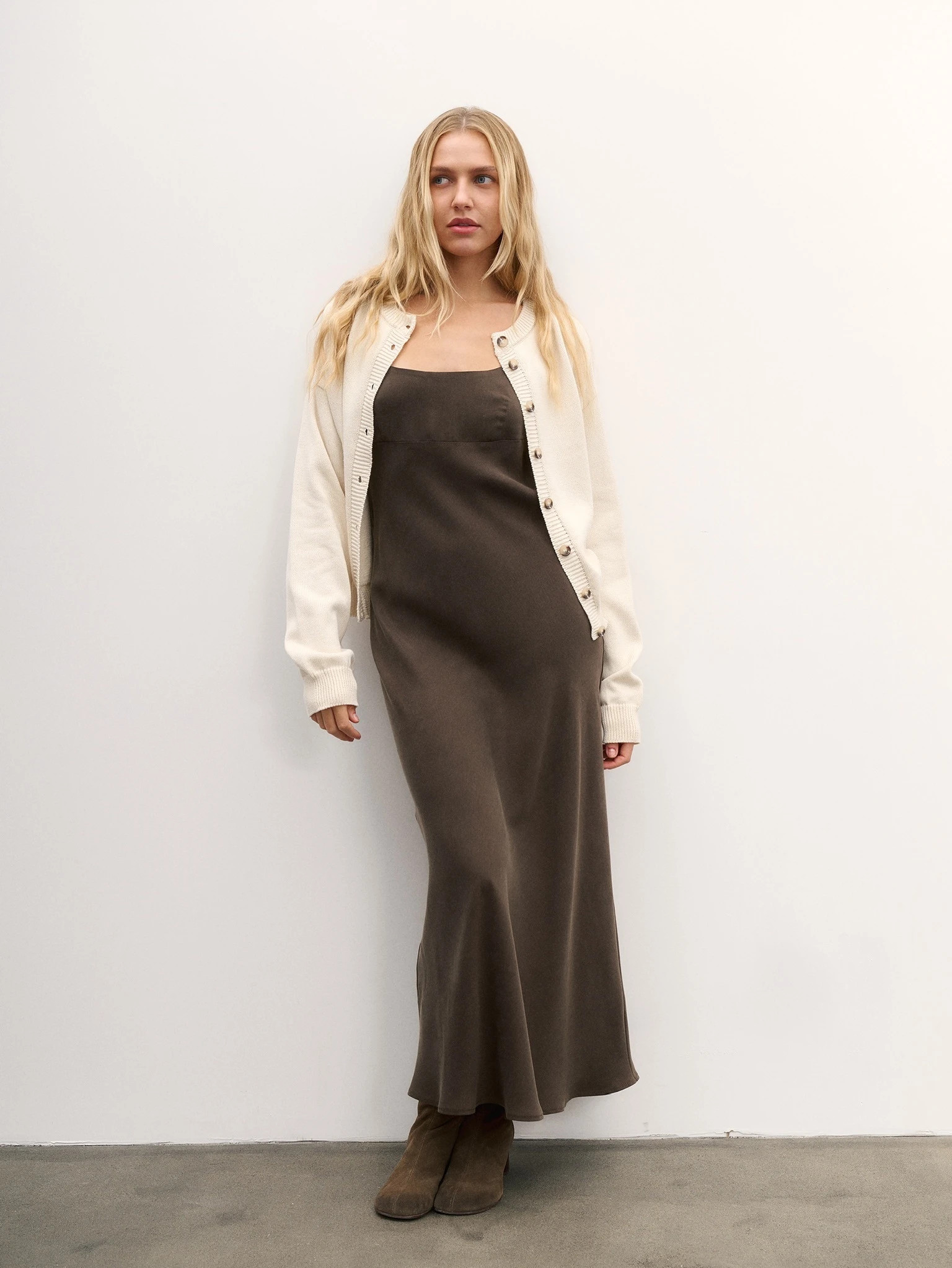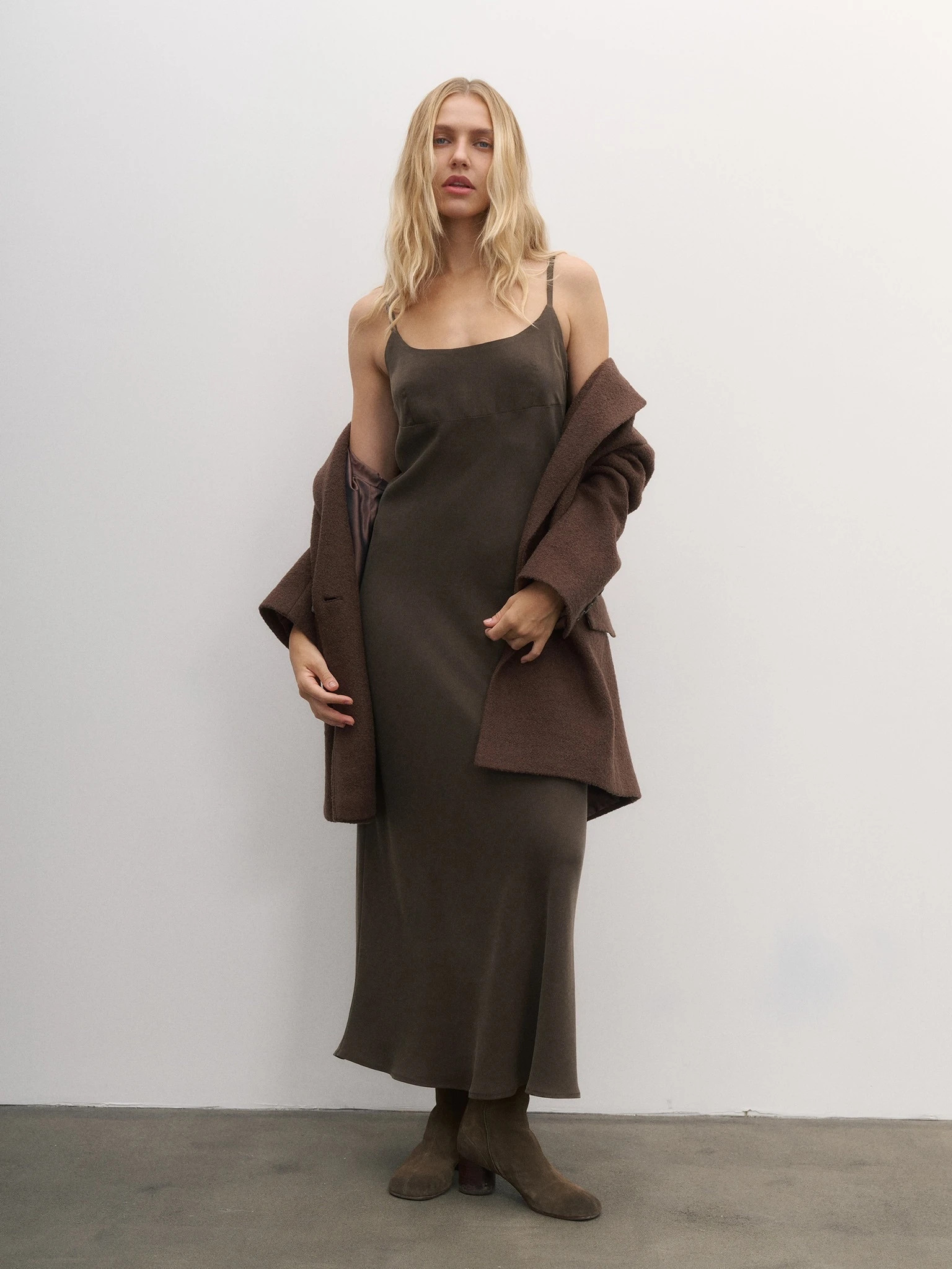 Комбинация макси из бархатистого тенсела. Полуприлегающий крой по "косой", U-образный вырез, тонкие бретели с регуляторами и застежка на потайную молнию сбоку. Отрезной лиф подчеркивает фигуру и делает образ более женственным и изящным. Подкладка на груди обеспечивает дополнительный комфорт.